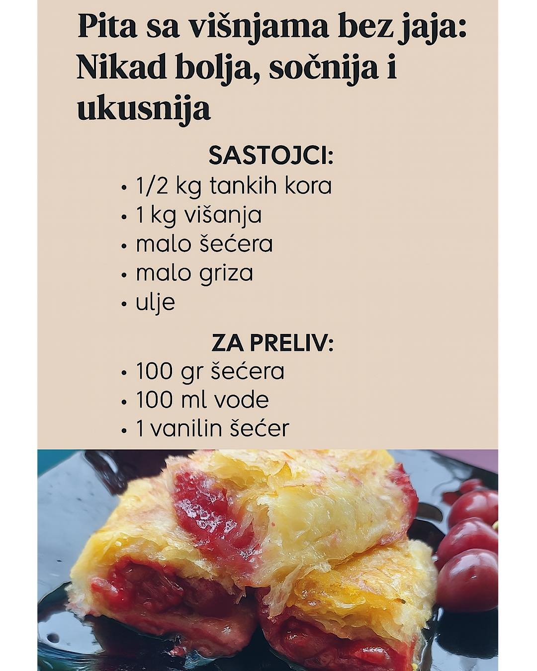 Priprema: Višnje dobro oprati izvaditi koščice. Koru raširiti na sto premazati uljem, posuti malo grizo 1 supena kašika, malo šećerom i poprskati vodom.