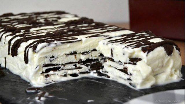 Ponovno stavi smjesu šlaga i vrhnja, te ponovi postupak s keksima, lješnjacima i čokoladom. Stavi preostalu smjesu šlaga i vrhnja. Stavi preko noći da se dobro zamrzne. Prije posluživanja izvadi jedno 15-ak minuta da se lakše reže. Poslužiti možete s čokoladim preljevom, preljevom od višanja… pustite mašti na volju! Preuzeto sa: https://www.coolinarika.com/