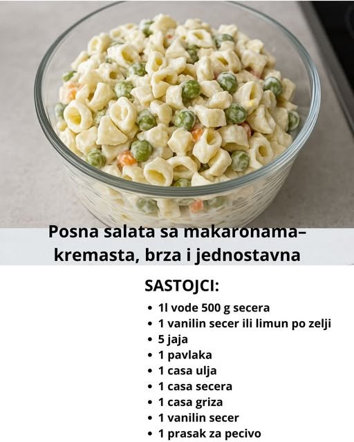 Posna salata sa makaronama je savršena ideja za brz i ukusan obrok tokom posta, slava, okupljanja sa gostima ili kao lagana večera. Kremasta je, osvežavajuća i veoma izdašna. Spremna je za svega nekoliko minuta, a sastojci su jednostavni i lako dostupni. Povrće iz zlatne mešavine daje boju i slatkastu notu, dok kiseli krastavčići dodaju svežinu i balans ukusa. Uz dodatak posnog majoneza i biljnog kačkavalja, ova posna salata postaje jako ukusna i hranljiva – pravi najbolji primer da posni recepti mogu biti i vrlo kremasti i vrlo bogati.