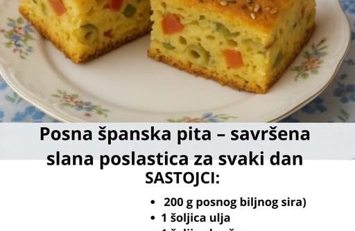 Ovo je jedan od onih posnih recepata koji oduševi i one koji ne poste. Posna španska pita je mekana, sočna, aromatična i prepuna boje — savršen izbor za brzi doručak, večeru, meze, posluženje za goste ili posnu trpezu. Biljni sir, alava paprika i zelene masline daju pun ukus i mediteranski pečat, a priprema traje samo nekoliko minuta. Sve se sjedini u jednoj činiji, izlije u tepsiju i peče — jednostavno, brzo i uvijek uspije!