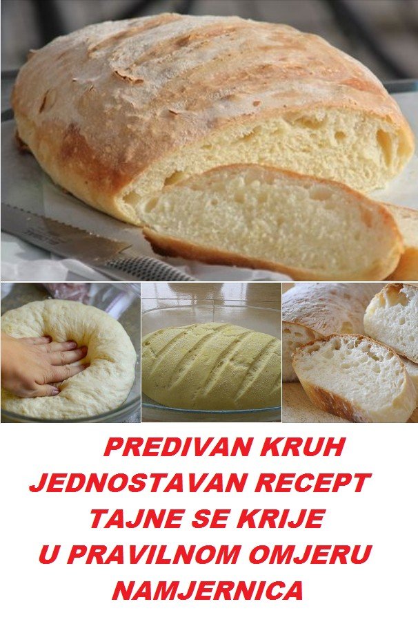 Na dno rerne stavite jednu plicu posudu u kojoj ste nalili vrele vode ali ne do vrha.U zagrejanu rernu pecite kruh zajedno sa vodom 10 min a zatim izvadite posudu sa vodom i nastavite kruh peci dok nepoprimi rumenu boju, ca 20 minuta. Peceni kruh izvadite na resetku da se ohladi