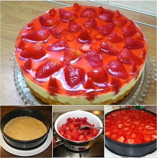 Kremu namazat na biskvit, po kremi složit jagode ili višnje, prelit preljevom za torte crvenim (to možete i nemorate) i ostavit u kalupu u hladnjaku par sati.