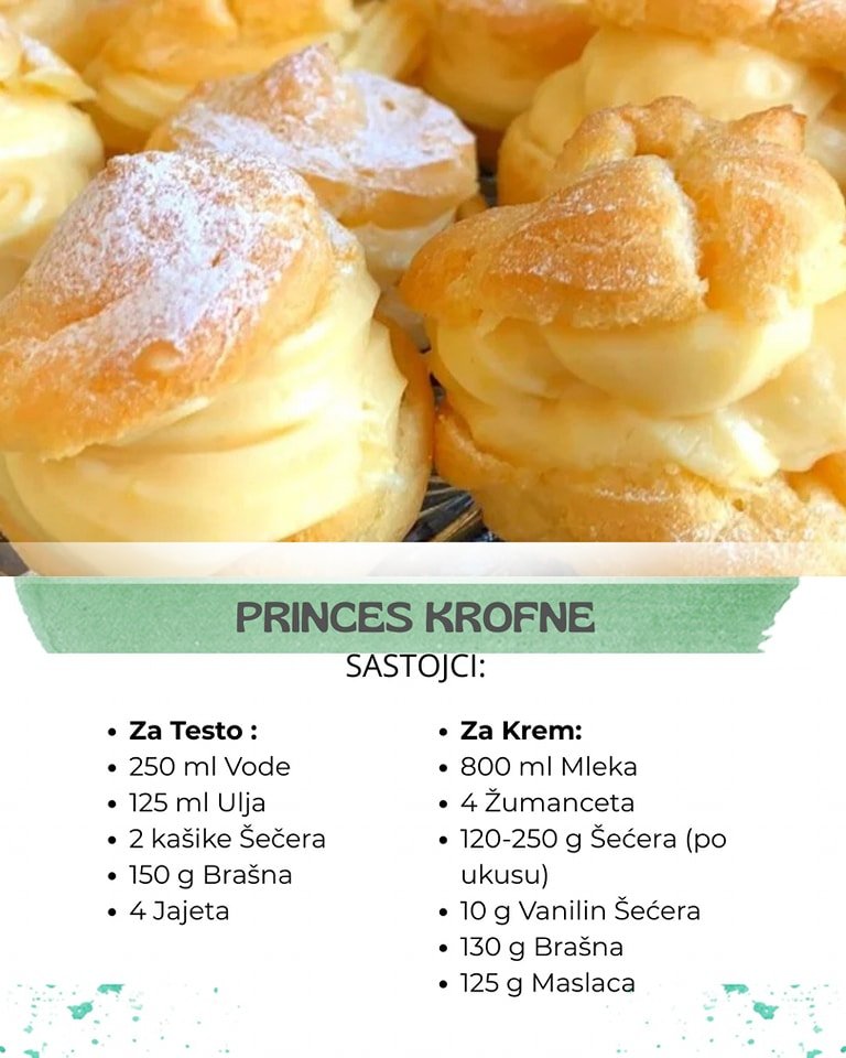 Princes Krofne koje se tope u ustima!Mekane i slasne Princes krofne koje se tope u ustima, kao zimske pahulje.Prelep spoj vanil krema sa mekanim krofnicama, nikoga ne ostavlja ravnodušnim.Definitivno jedan od najboljih poslastica, kojoj se svi obraduju.