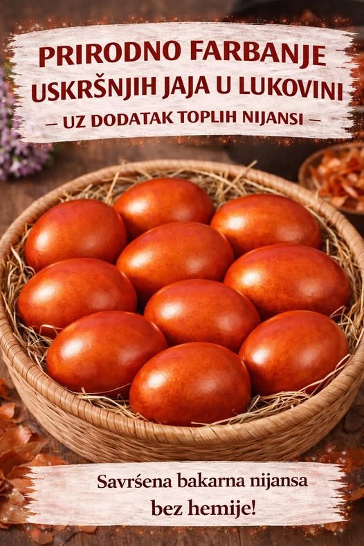 Prirodno farbanje uskršnjih jaja u lukovini je jedan od najstarijih i najlepših načina ukrašavanja jaja, koji daje tople, bakarne i zlatno-crvene nijanse bez upotrebe hemije. Ova metoda ne samo da je zdrava i bezbedna, već daje i autentičan, rustičan izgled jajima kakav se nekada pravio u bakinoj kuhinji. Boja zavisi od količine lukovine i vremena kuvanja, pa možeš dobiti sve – od nježno zlatne do duboke crveno-smeđe nijanse.