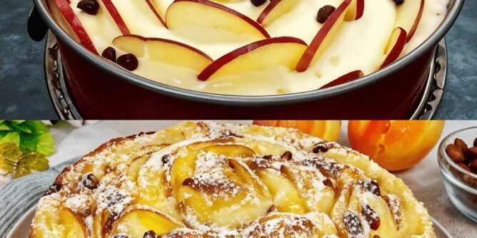 Preko kreme ravnomjerno rasporedite ostatke tijesta pa na tijesto poslažite tanke ploške jabuke.