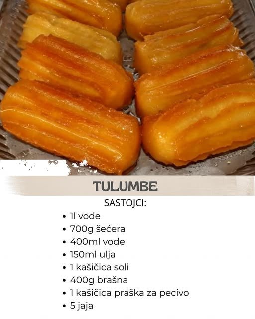 Za pripremu tulumbi potrebno je 400 ml vode, 150 ml ulja i 1 kašičicu soli prokuvati, za to vreme u 400 g brašna dodati 1 kašičicu praška za pecivo, pa brašno sipati u ključalu vodu, mešati 2-3 minuta i ostaviti da se ohladi.