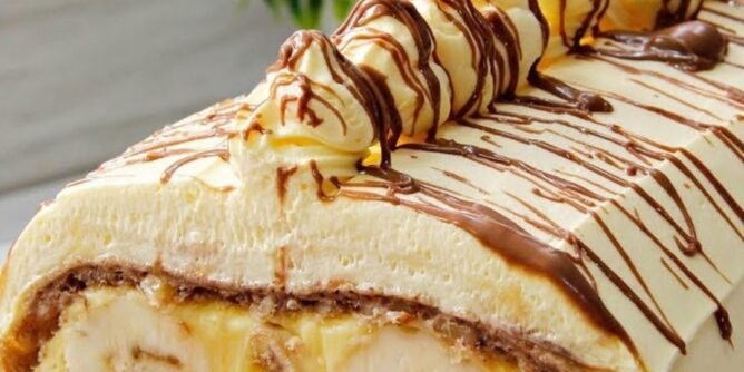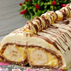 Banane uvaljati u sok od limuna, poredati ih na krajeve biskvita i urolati sa obe strane.