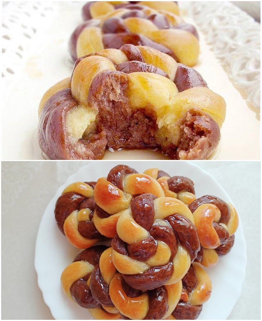 1 l vodepremijesiti tijesto na radnoj povrsini i od svakog odvojiti po 24 loptice, moze i manje ovisno kolike turbane zelite. razvuci jednu svijetlu i jednu braon lopticu u valjke,valjke u pletenice i brzo u krug tj. u turban,zavuci kraj turbana ispod da se prilikom pecenja ne odvoji