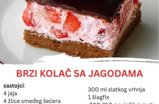 Nakon što se kolač ohladi i stegne, režite ga na kocke i, ako želite dodatnu eleganciju, na svaku kocku možete staviti svježu jagodu. Efekat je predivan – i vizualno i okusno.