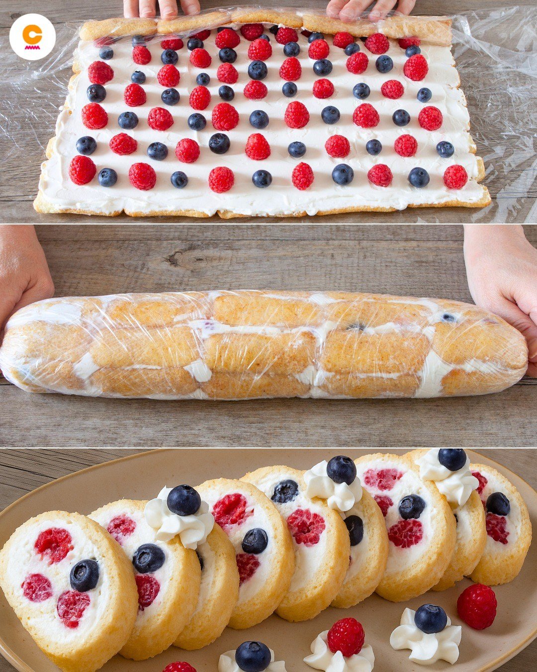 Nakon hlađenja, skinite foliju, premažite rolat ostatkom kreme i ukrasite bobičastim voćem. Narežite na kriške i poslužite .