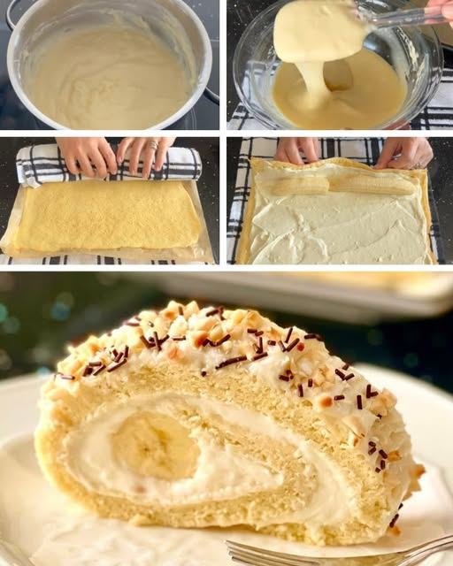 Kada se krema ohladi, dodajte šlag i umutite. Kremu nanesite na biskvit, stavite isečene banane, prelijte ostatkom kreme i po želji na površini pravite ukrase viljuškom. Tortu možete dekorisati po želji i poslužiti.