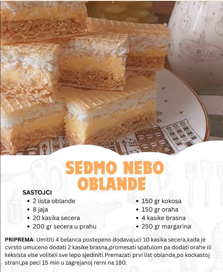 Sedmo nebo oblande nisu slučajno dobile svoje ime. Ovaj recept je proveren klasik koji se prenosi generacijama i uvek izaziva oduševljenje. Kombinacija hrskavih oblandi, penaste kore od belanaca sa orasima i kokosom, i bogatog žutog krema od žumanaca stvara savršen balans tekstura i ukusa.