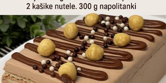 Sipajte prvi deo fila, pa poravnajte, pa poređajte napolitanke. Zatim nastavite tako dok ne utrošite sve sastojke, a poslednji red treba da bude fil. Pokrijte i stavite u zamrzivač na 2 sata. Ako želite ukrasite nutelom i lešnicima.