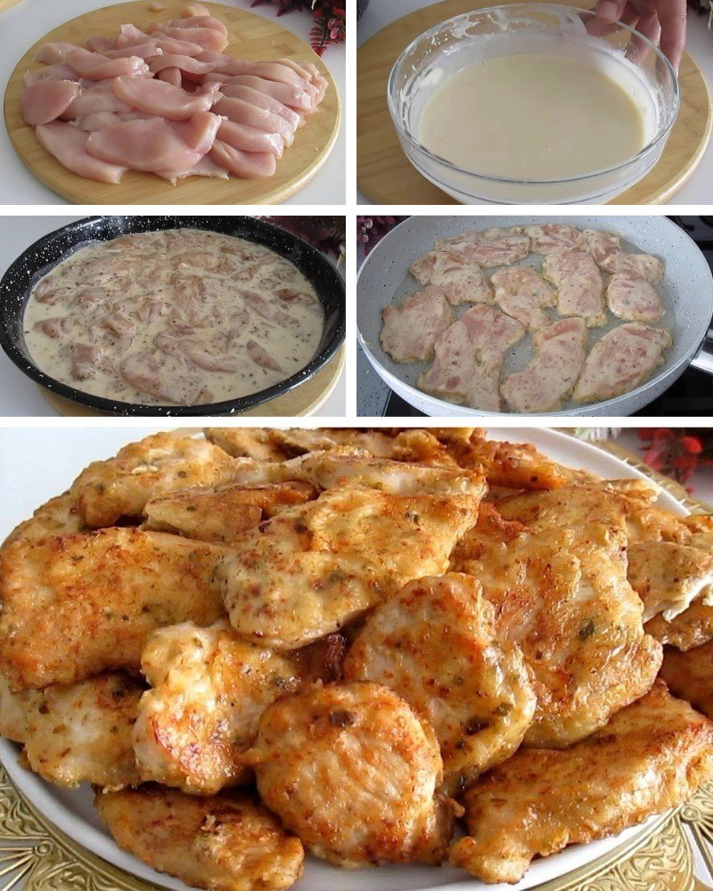 * Pileće filete isecite na tanke šnicle, najbolje poprečno, da budu manje i lakše za prženje.