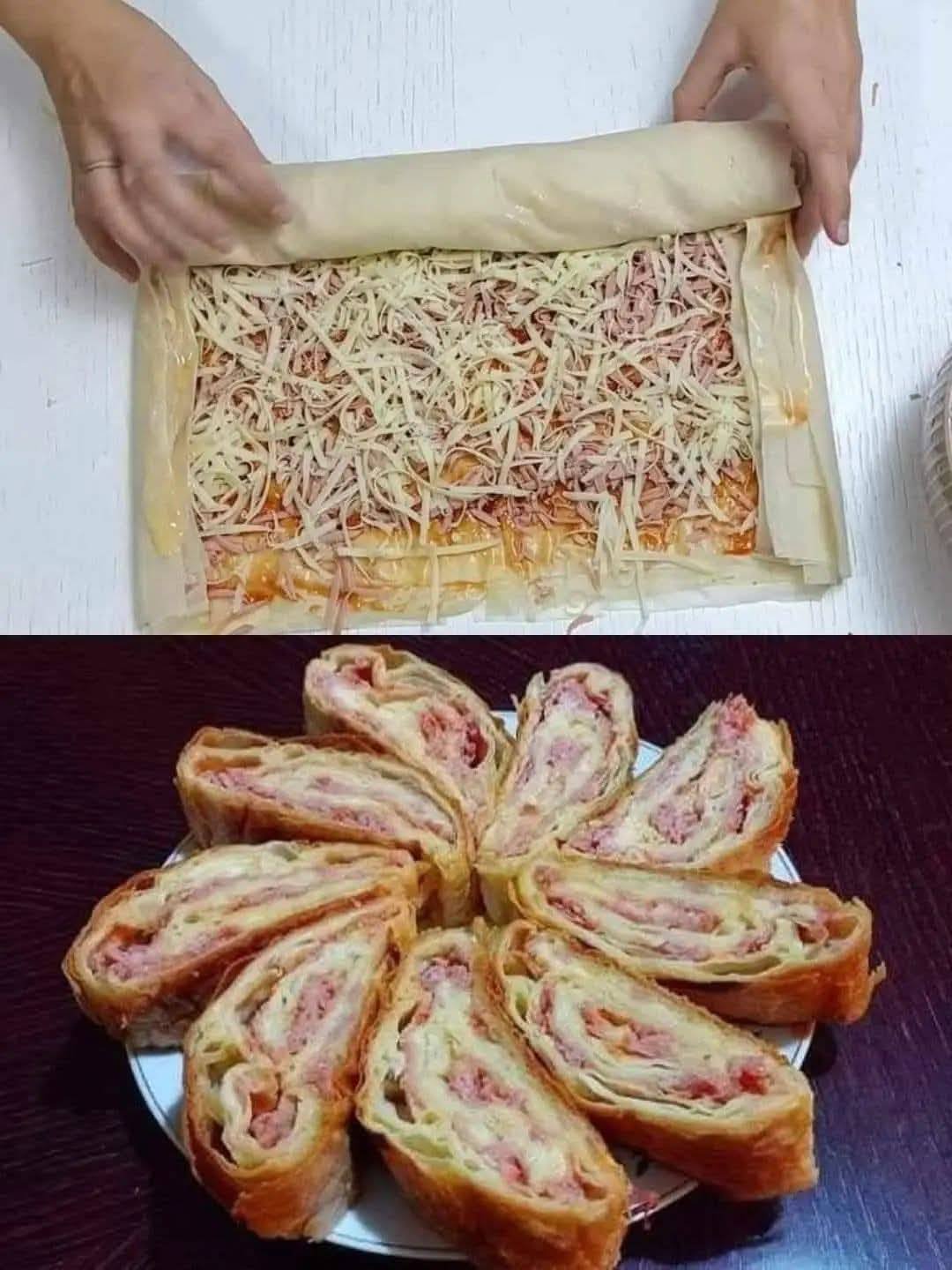 Na tacnu staviti prvo 2 lista.Preko premazati malo umucene pavlake sa jajima, pa odgore kora, pa je premazete kecapom i pospete malo origana, pa preko opet kora i nju namazete pavlakom i jajima i poredjate salamu, preko opet stavite koru i na nju narendate 150g trapista i preko kora koju namazete pavlakom i jajima.To sve zavijte u rolat.