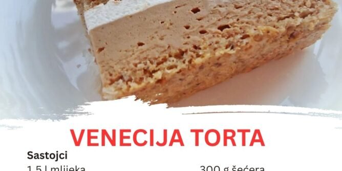 Prvi korak u pripremi torte Venecija je pravljenje kore. Uzmite belanca i umutite ih u čvrsti sneg. Započnite dodajući šećer kašiku po kašiku, nastavljajući miksanje dok se šećer u potpunosti ne otopi, a smesa postane čvrsta i glatka. Zatim dodajte mljevene lješnjake, brašno i prašak za pecivo. Spatula je najbolje koristiti kako biste pažljivo umešali suve sastojke u smesu, bez da narušite strukturu snijega.