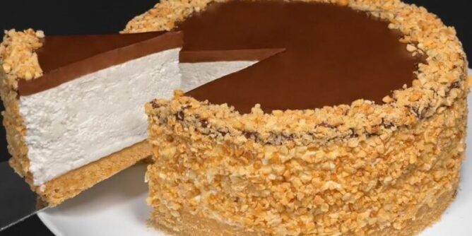 Sipajte preko keksa i lepo poravnajte. Istopite čokoladu sa slatkom pavlakom, pa prelijte preko fila. Ivicu pokrijte sekcanim kikirikijem i stavite u frižider da se stegne. Skinite obruč i tortu obložite seckanim kikirikijem.
