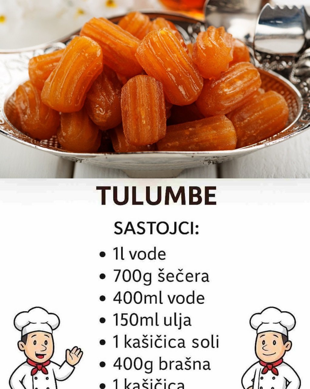 Za pripremu tulumbi potrebno je 400 ml vode, 150 ml ulja i 1 kašičicu soli prokuvati, za to vreme u 400 g brašna dodati 1 kašičicu praška za pecivo, pa brašno sipati u ključalu vodu, mešati 2-3 minuta i ostaviti da se ohladi.
