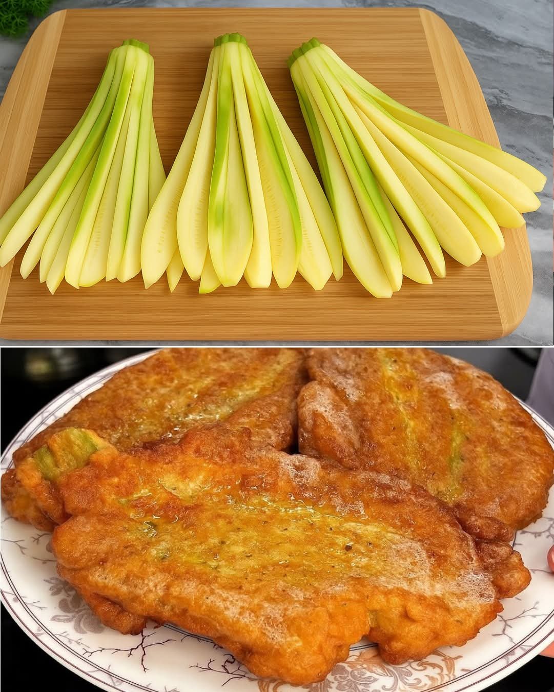 Korak 4: Pomoću šupljikave žlice izvadite kriške tikvica i prebacite ih na čistu kuhinjsku krpu. Ostavite ih da se ohlade 5 minuta, a zatim ih papirnatim ručnicima nježno osušite kako biste uklonili višak vlage. Ovaj postupak je neophodan za postizanje idealne hrskave korice.